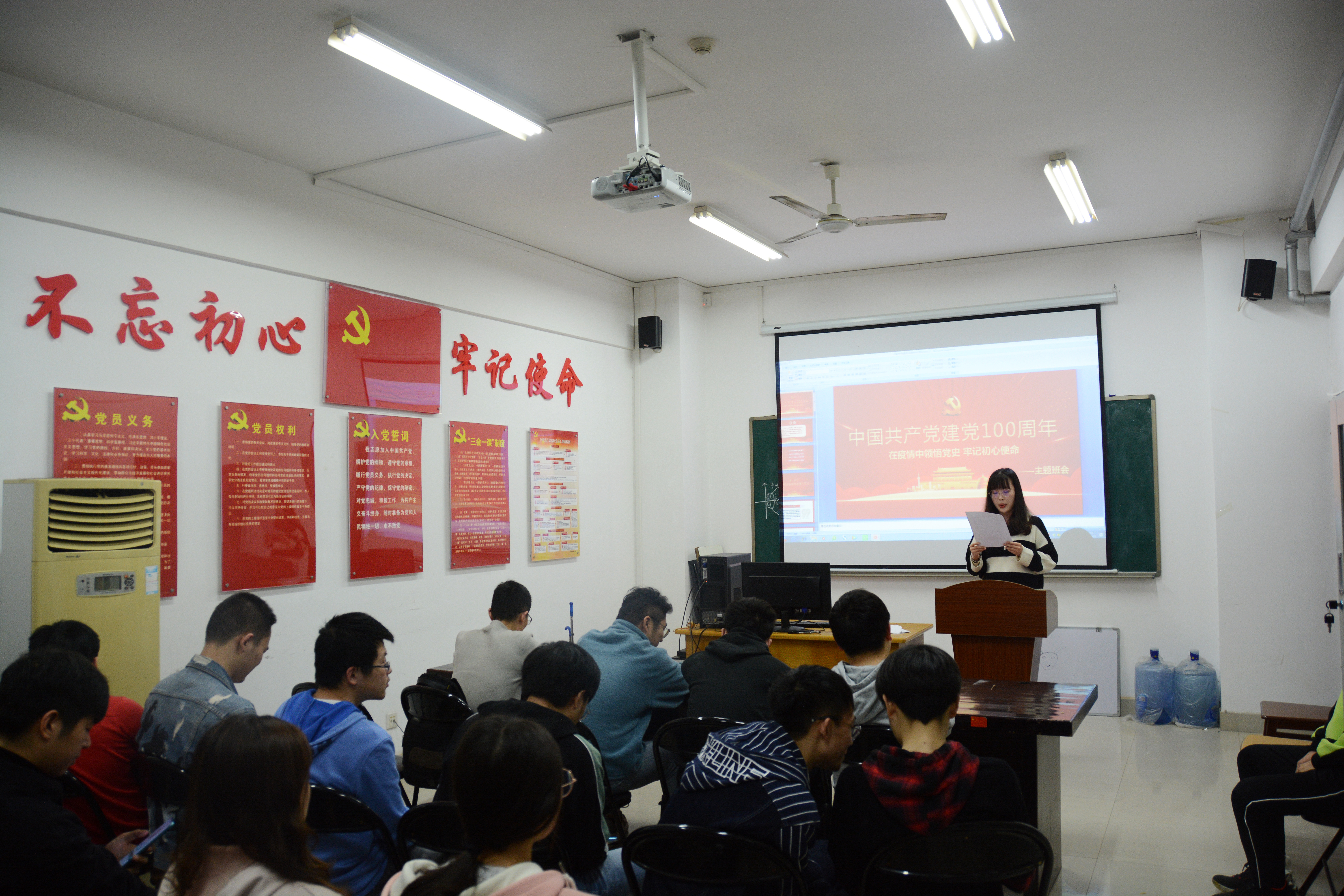 2021年4月15日晚,计算机与信息工程学院2020级硕士2班在求是楼709报告厅开展了主题为“学党史,知党恩,跟党走”的主题班会。庆祝即将到来的中国共产党100周年华诞,引导同学们进一步了解党、热爱党、拥护党,增强对党、对祖国、对人民的深厚情感。此次班会由班长盘祺主持,参会人员包括硕士2班全体同学和辅导员陈慧慧老师。